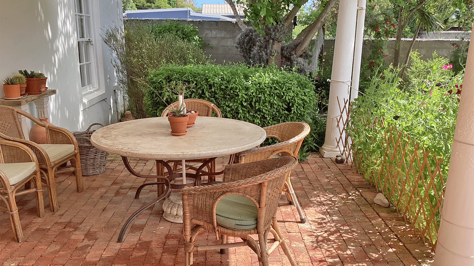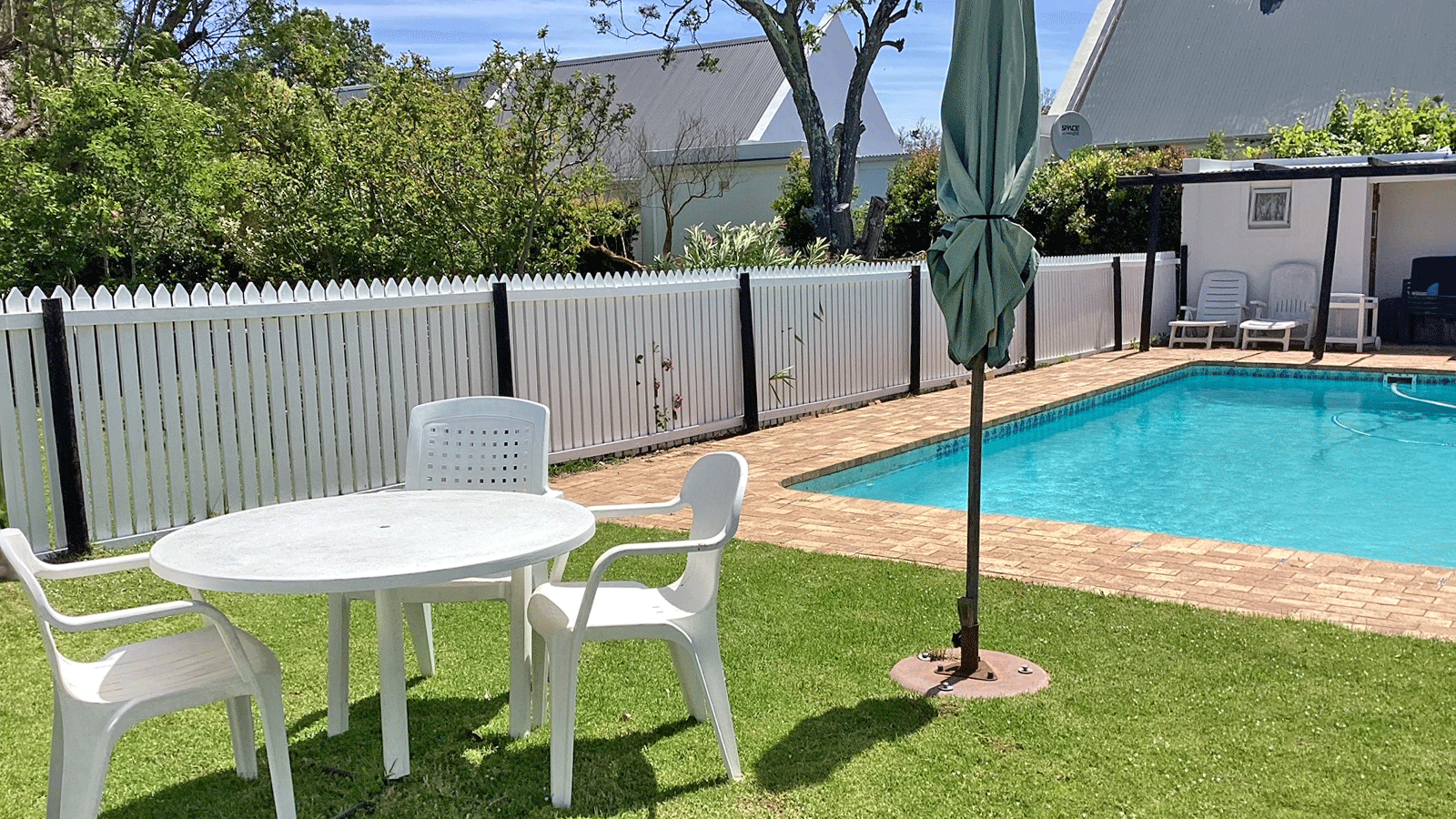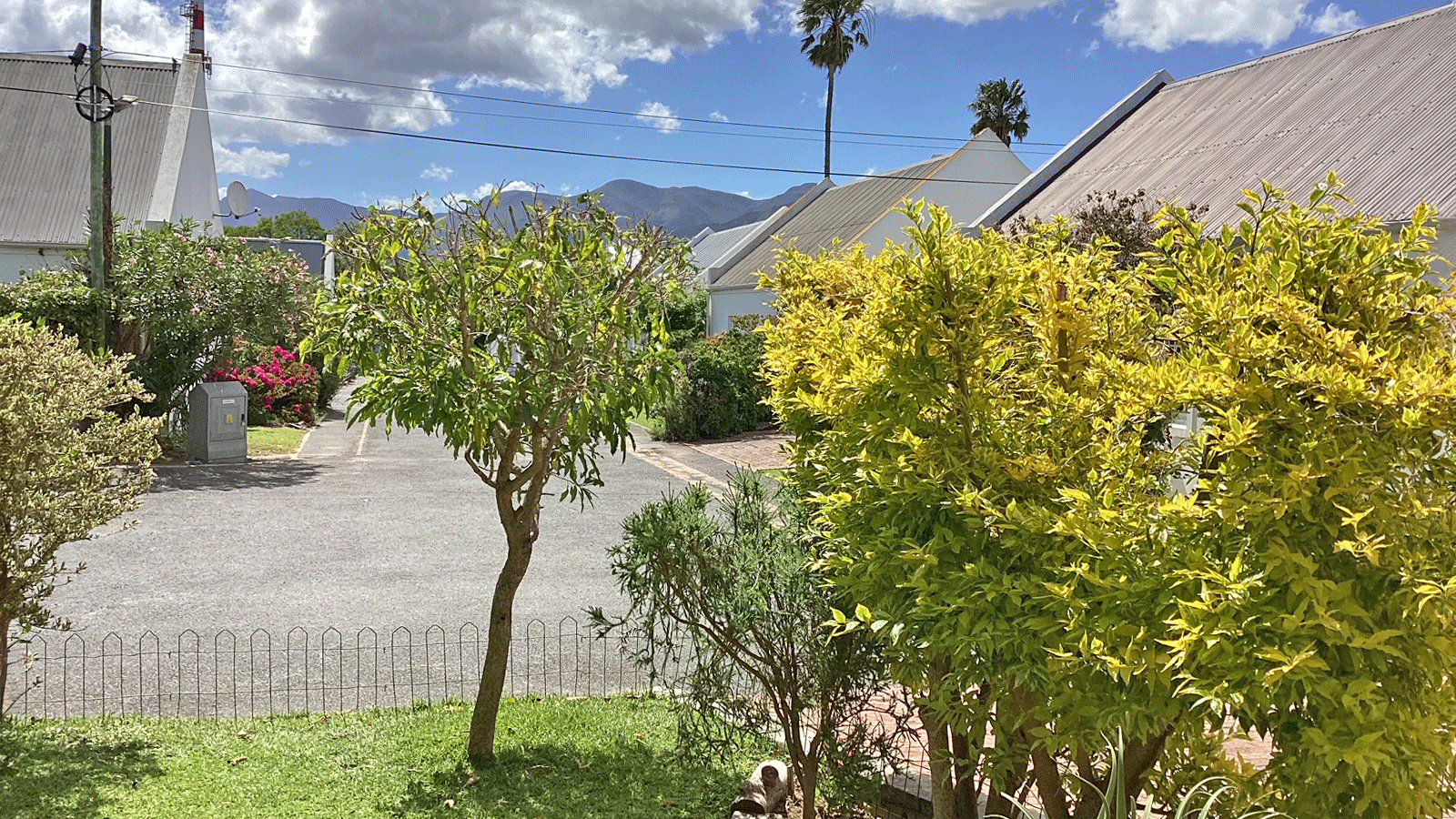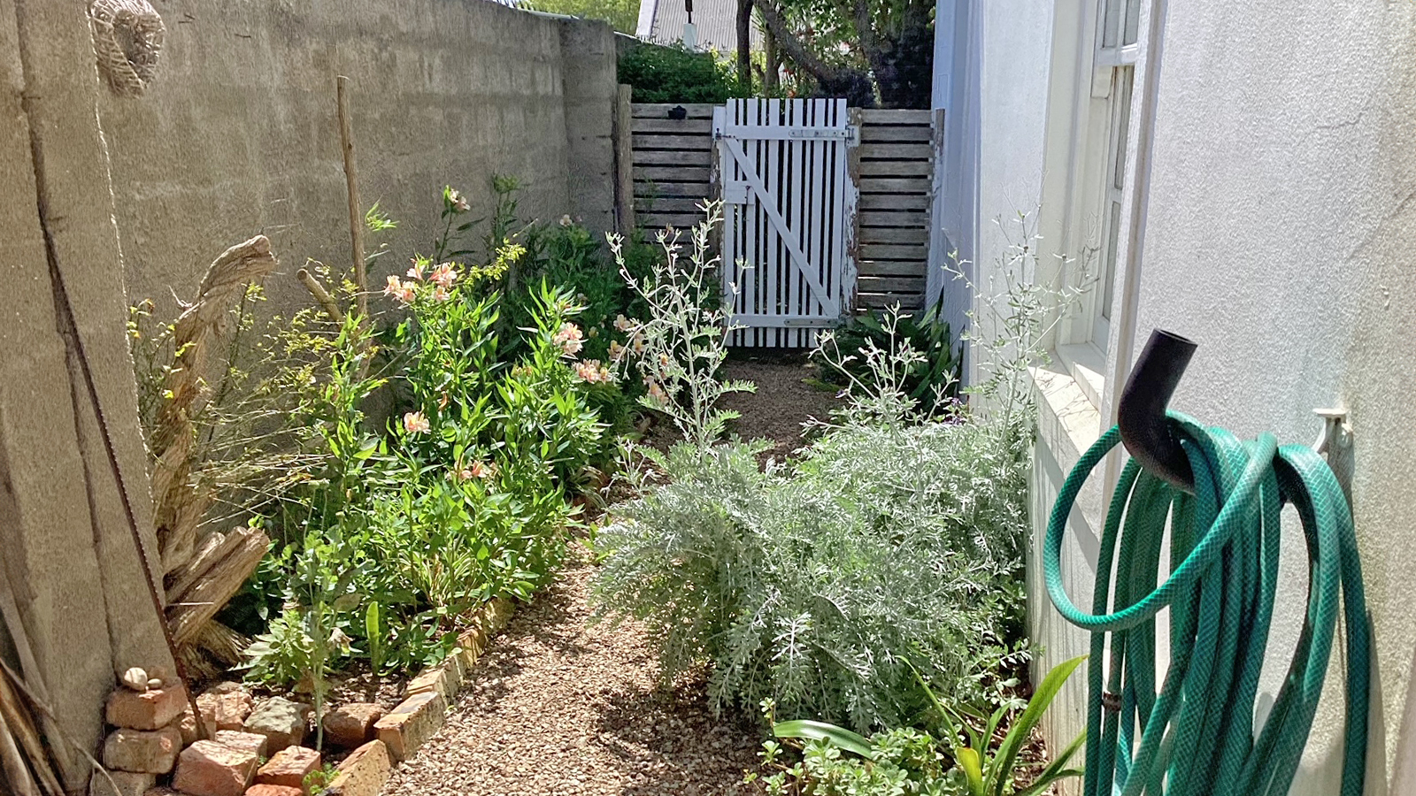 The home features two well-sized bedrooms with built-in cupboards, a modern bathroom with a walk-in shower, and a separate guest loo. The open-plan kitchen, dining, and lounge area is filled with natural light and flows effortlessly onto a covered stoep that looks out over the private garden – ideal for relaxing or entertaining.