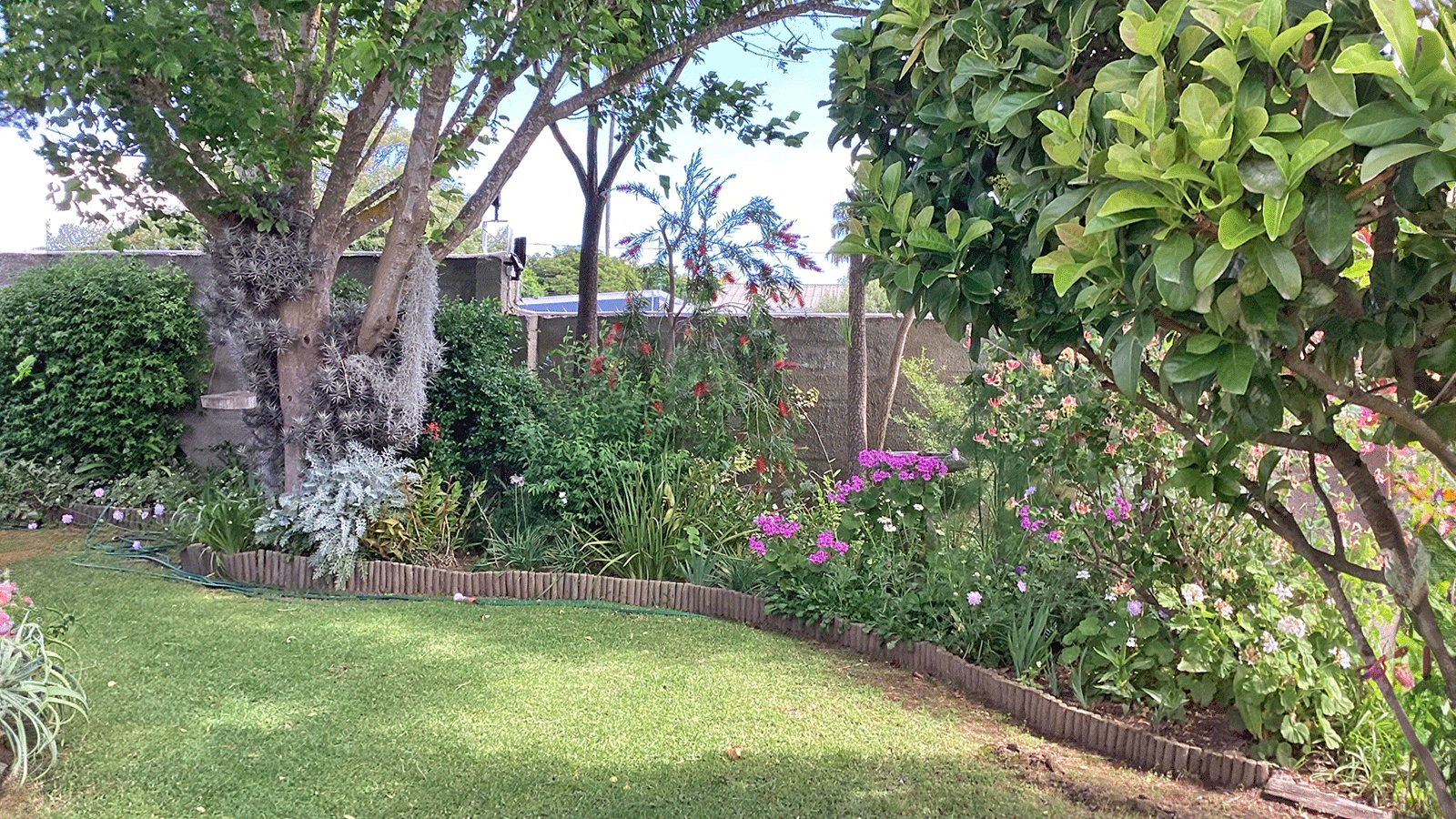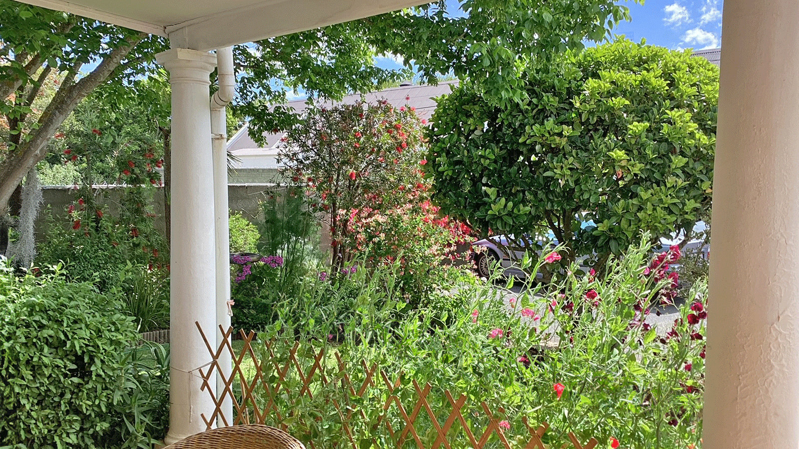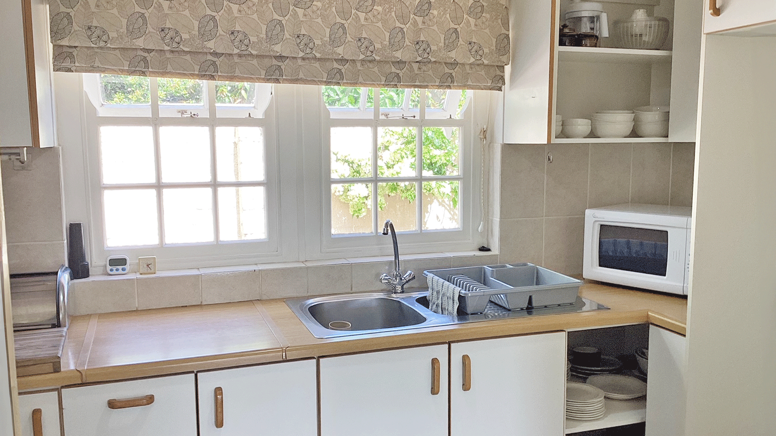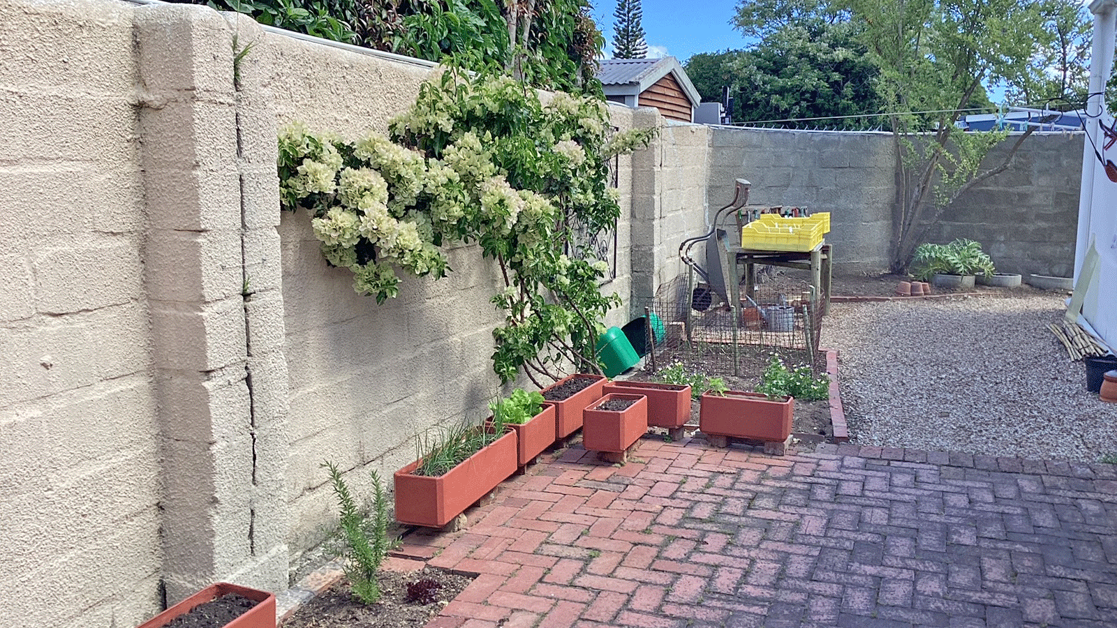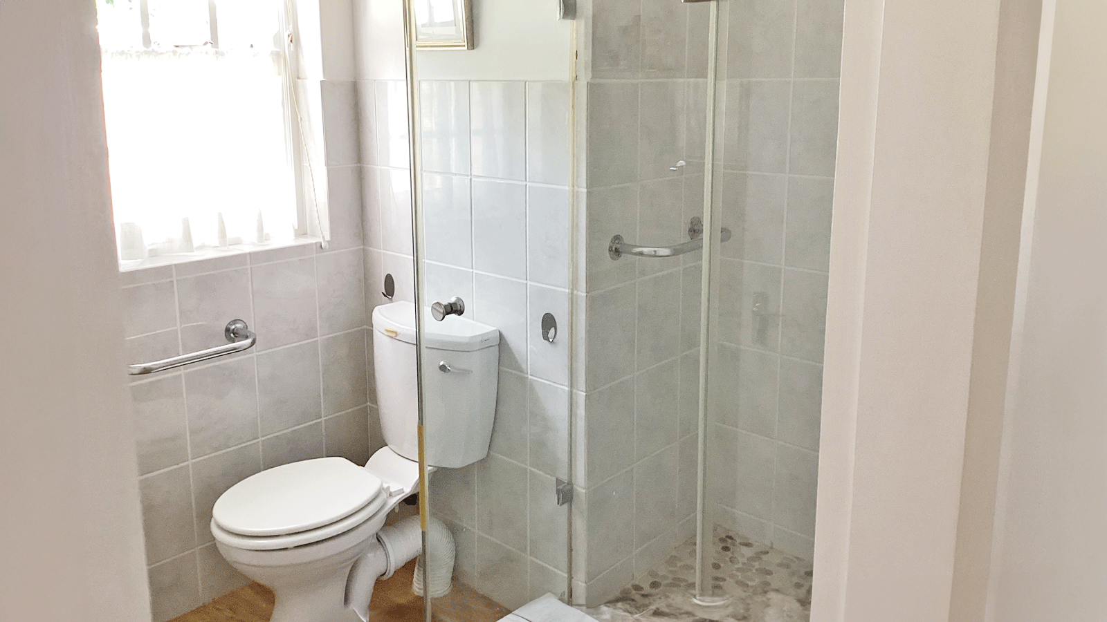 The home features two well-sized bedrooms with built-in cupboards, a modern bathroom with a walk-in shower, and a separate guest loo. The open-plan kitchen, dining, and lounge area is filled with natural light and flows effortlessly onto a covered stoep that looks out over the private garden – ideal for relaxing or entertaining.