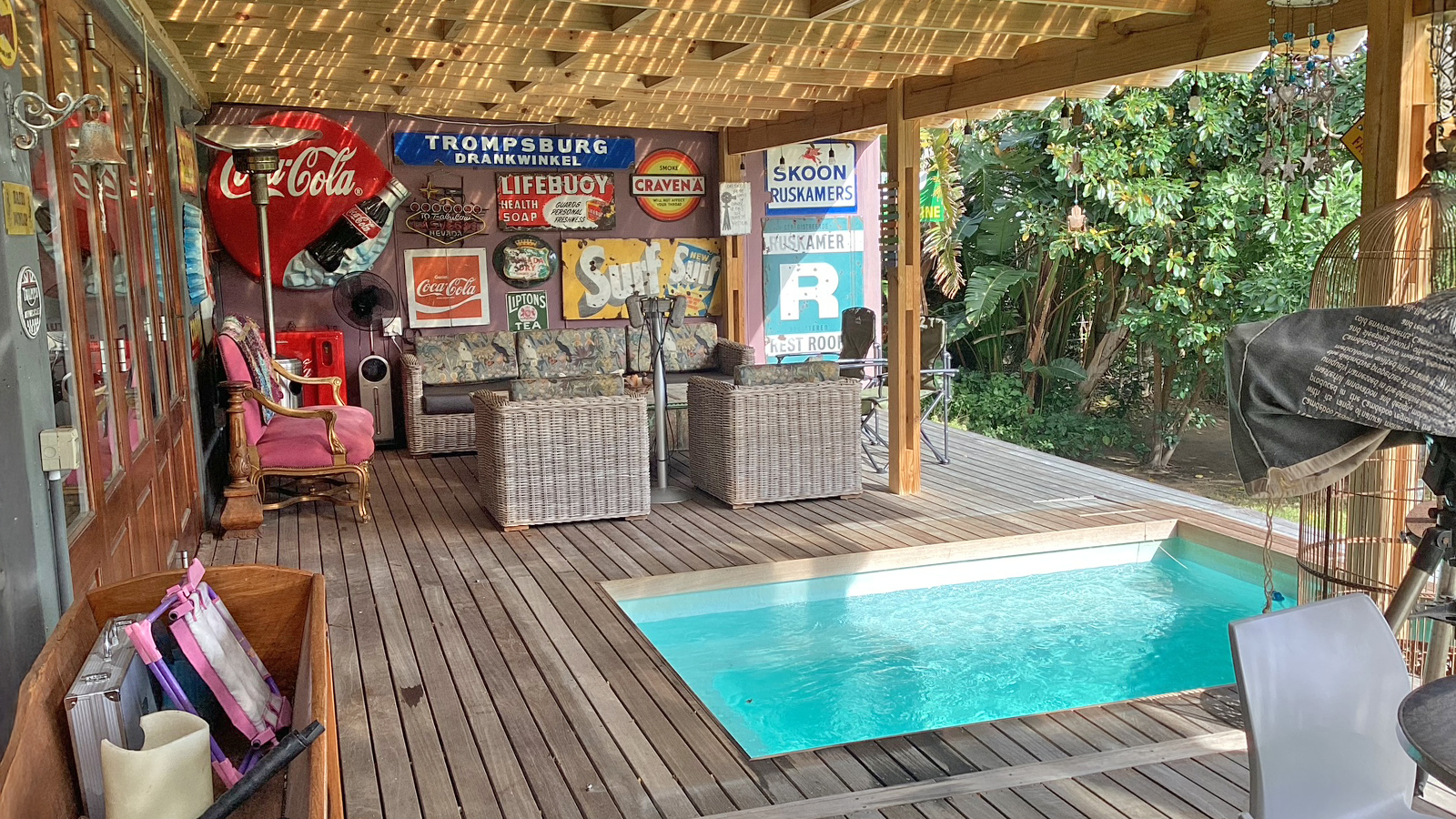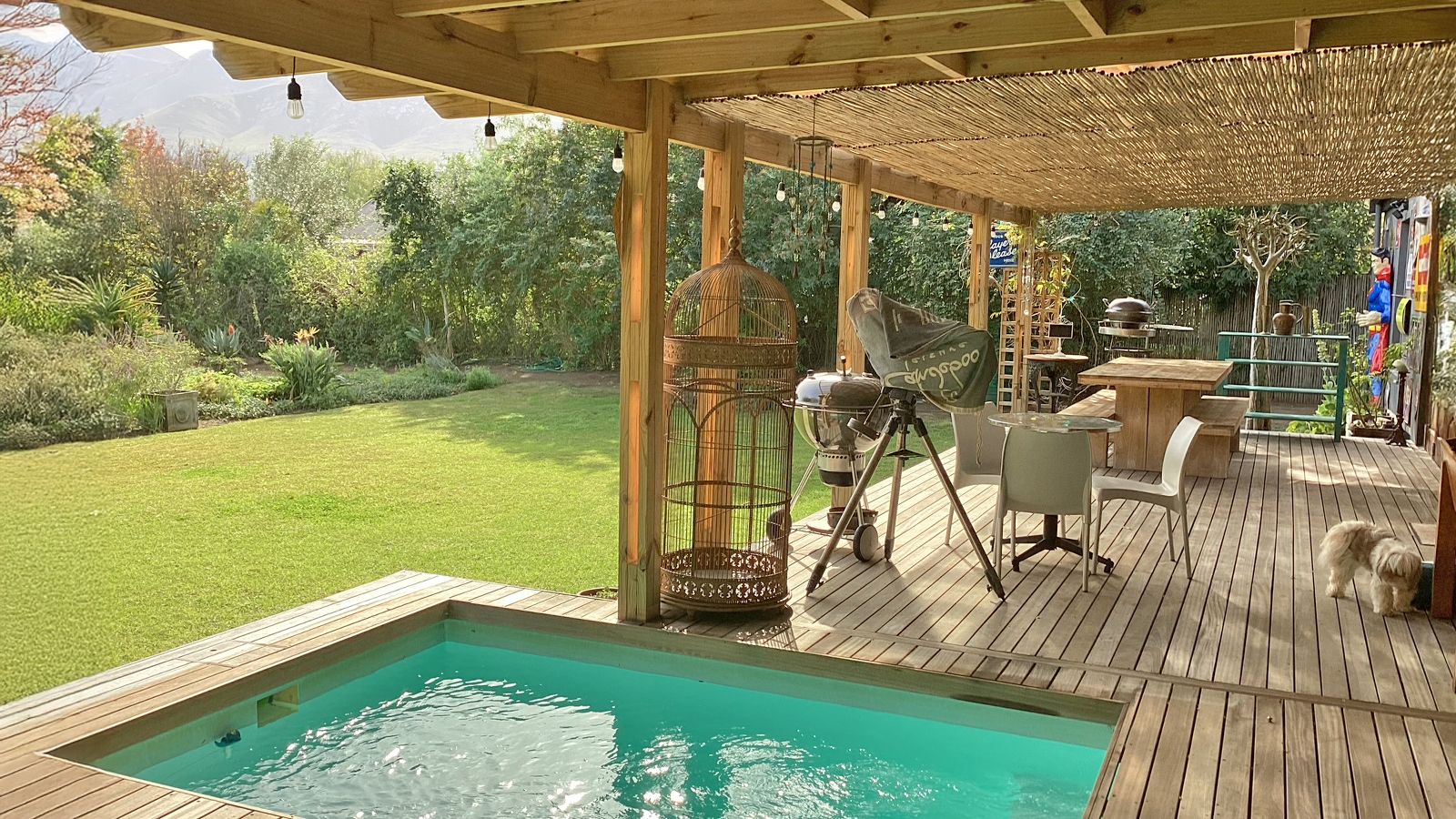 Glass doors open onto a spacious covered deck with a splash pool, overlooking an immaculate, beautifully maintained garden shaded by mature trees—your perfect summer escape.