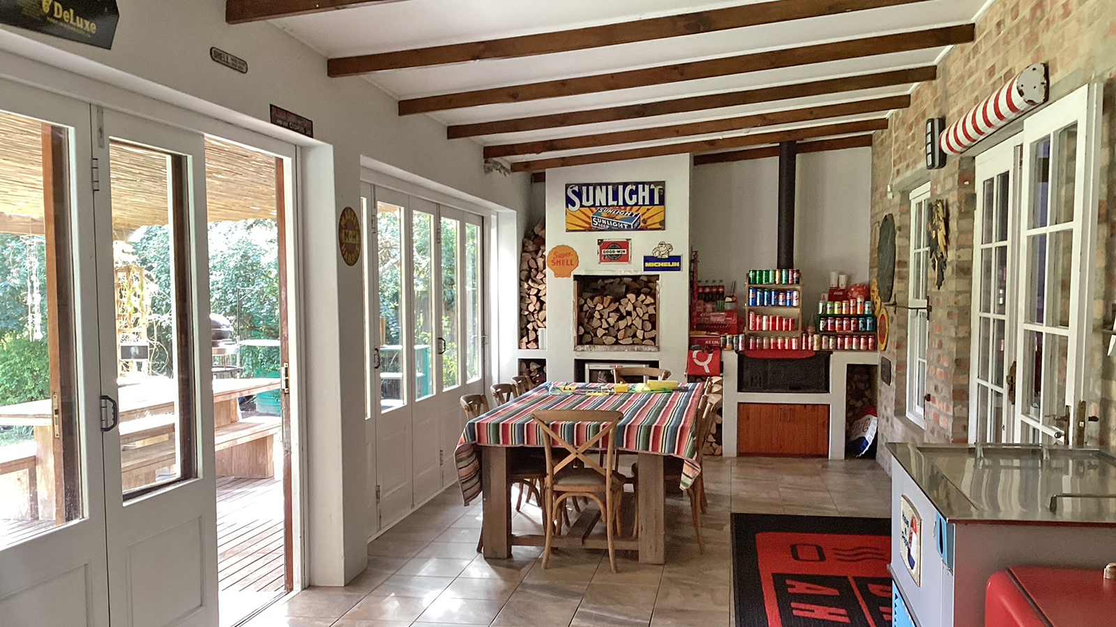 At the heart of the home is an extra-large farmhouse kitchen that flows into a comfortable lounge and dining area, complete with a large fireplace that adds warmth and character for cosy winter evenings. The open-plan layout continues into an enclosed entertainment room with an indoor braai, ideal for hosting long, leisurely lunches or dinners for up to 20 guests.